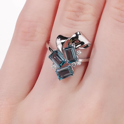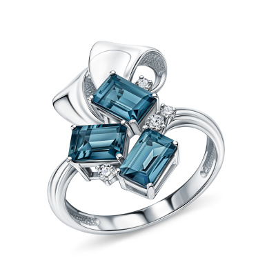 Кольцо с 2 бриллиантами природными, 0.06 карат, огранка круг 57 граней, цвет 3, чистота 6, тип огранки А; 2 бриллиантами природными, 0.03 карат, огранка круг 57 граней, цвет 3, чистота 6, тип огранки А; 3 топазами лондон природными, 2.29 карат, тип огранки А; Белое золото 585 пробы.