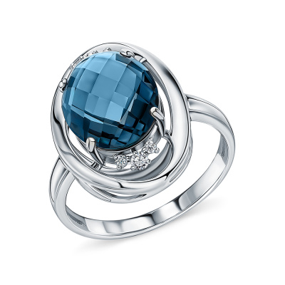Кольцо с 2 бриллиантами природными, 0.04 карат, огранка круг 57 граней, цвет 3, чистота 6, тип огранки А; 4 бриллиантами природными, 0.02 карат, огранка круг 57 граней, цвет 3, чистота 6, тип огранки А; 1 топазом лондон природным, 5.11 карат, тип огранки А; Белое золото 585 пробы.