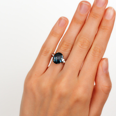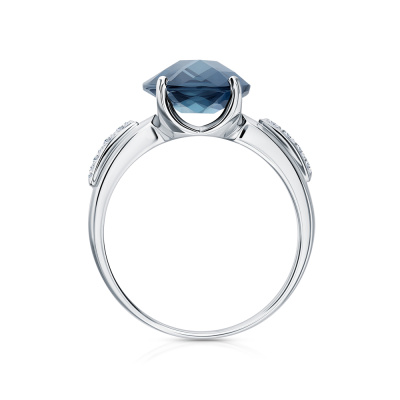 Кольцо с 8 бриллиантами природными, 0.12 карат, огранка круг 57 граней, цвет 3, чистота 6, тип огранки А; 1 топазом лондон природным, 5.29 карат, тип огранки А; Белое золото 585 пробы.