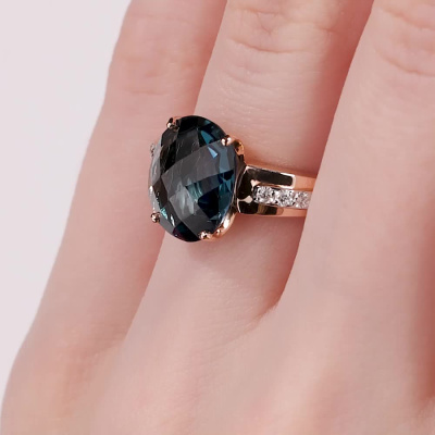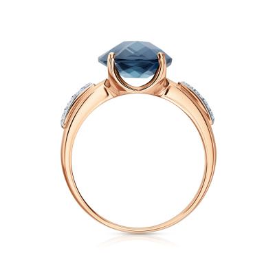 Кольцо с 8 бриллиантами природными, 0.12 карат, огранка круг 57 граней, цвет 3, чистота 6, тип огранки А; 1 топазом лондон природным, 4.78 карат, тип огранки А; Розовое золото 585 пробы.