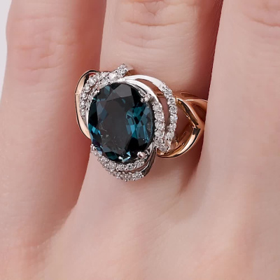 Кольцо с 7 бриллиантами природными, 0.05 карат, огранка круг 57 граней, цвет 3, чистота 5, тип огранки А; 30 бриллиантами природными, 0.14 карат, огранка круг 57 граней, цвет 4, чистота 5, тип огранки А; 1 топазом лондон природным, 4.95 карат, тип огранки А; золото 585 пробы.