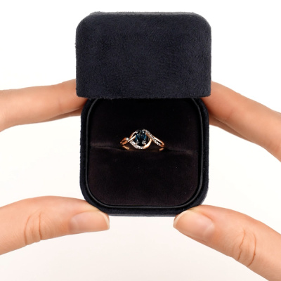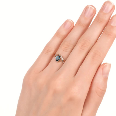Кольцо с 8 бриллиантами природными, 0.03 карат, огранка круг 17 граней, цвет 2, чистота 2; 1 топазом лондон природным, 0.56 карат; Розовое золото 585 пробы.