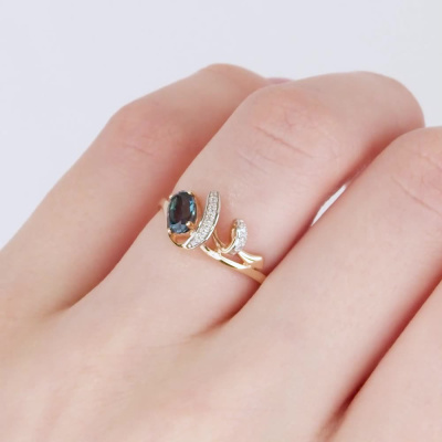 Кольцо с 10 бриллиантами природными, 0.02 карат, огранка круг 57 граней, цвет 3, чистота 6; 1 топазом лондон природным, 0.53 карат; Розовое золото 585 пробы.