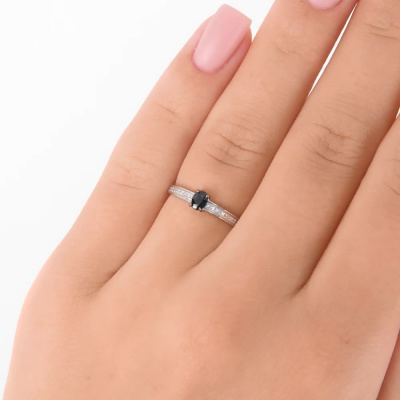 Кольцо с 18 бриллиантами природными, 0.04 карат, огранка круг 17 граней, цвет 2, чистота 2, тип огранки А; 1 сапфиром природным, 0.2 карат, цвет 2, чистота 2, тип огранки Б; Белое золото 585 пробы.