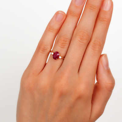 Кольцо с 2 бриллиантами природными, 0.05 карат, огранка круг 57 граней, цвет 3, чистота 6, тип огранки А; 1 рубином природным, 1.49 карат, цвет 2, чистота 2, тип огранки Б; Розовое золото 585 пробы.