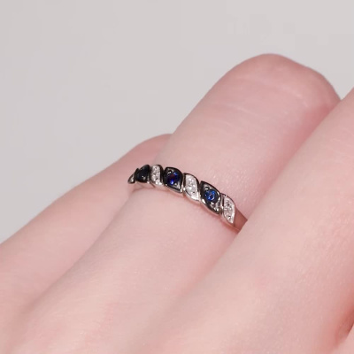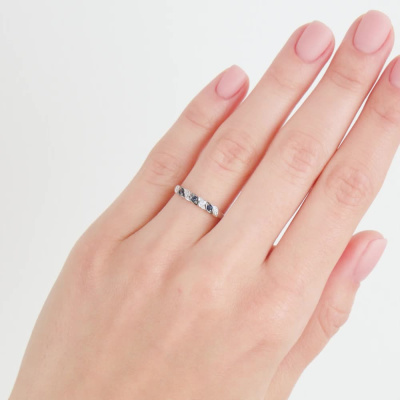 Кольцо с 8 бриллиантами природными, 0.01 карат, огранка круг 17 граней, цвет 2, чистота 2, тип огранки А; 3 сапфирами природными, 0.08 карат, цвет 2, чистота 2, тип огранки В; Белое золото 585 пробы.