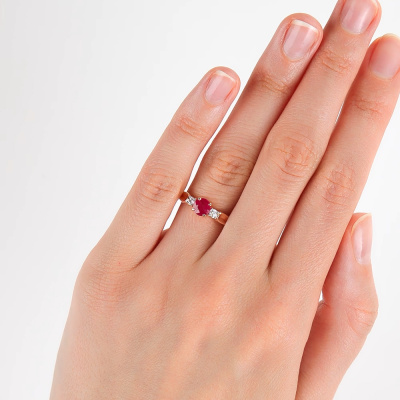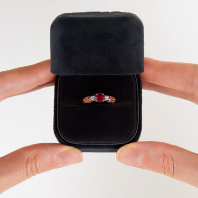 Кольцо с 2 бриллиантами природными, 0.11 карат, огранка круг 57 граней, цвет 3, чистота 6, тип огранки А; 1 рубином природным, 0.63 карат, цвет 2, чистота 2, тип огранки В; Розовое золото 585 пробы.