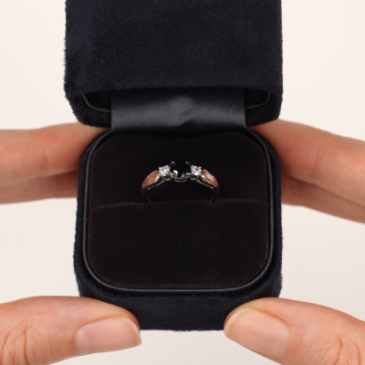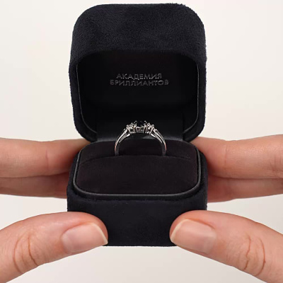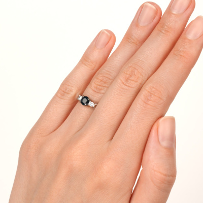 Кольцо с 2 бриллиантами природными, 0.11 карат, огранка круг 57 граней, цвет 3, чистота 6, тип огранки А; 1 сапфиром природным, 0.57 карат, цвет 2, чистота 2, тип огранки В; Белое золото 585 пробы.