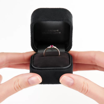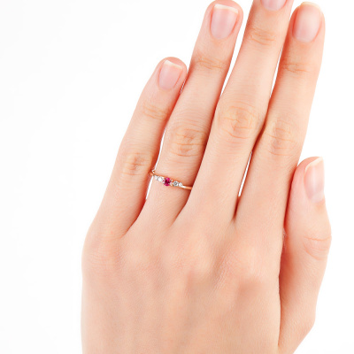 Кольцо с 2 бриллиантами природными, 0.04 карат, огранка круг 57 граней, цвет 3, чистота 6, тип огранки А; 2 бриллиантами природными, 0.01 карат, огранка круг 57 граней, цвет 3, чистота 6, тип огранки А; 1 рубином природным, 0.12 карат, цвет 2, чистота 2, тип огранки В; Розовое золото 585 пробы.