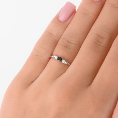 Кольцо с 2 бриллиантами природными, 0.04 карат, огранка круг 57 граней, цвет 3, чистота 6, тип огранки А; 2 бриллиантами природными, 0.01 карат, огранка круг 57 граней, цвет 3, чистота 6, тип огранки А; 1 сапфиром природным, 0.12 карат, цвет 2, чистота 2, тип огранки В; Белое золото 585 пробы.