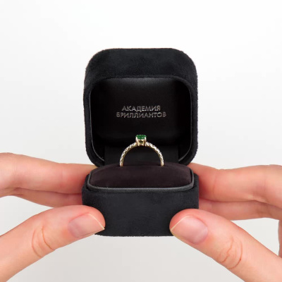 Кольцо с 12 бриллиантами природными, 0.31 карат, огранка круг 57 граней, цвет 3, чистота 6, тип огранки А; 1 изумрудом природным, 0.47 карат, цвет 3, чистота 3, тип огранки В; Желтое золото 585 пробы.
