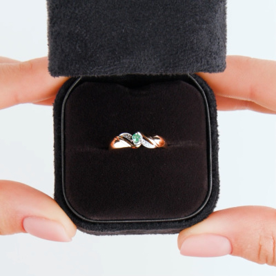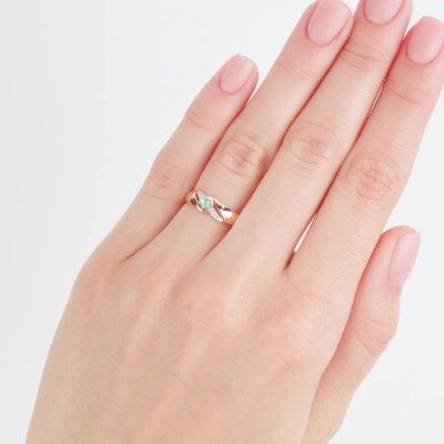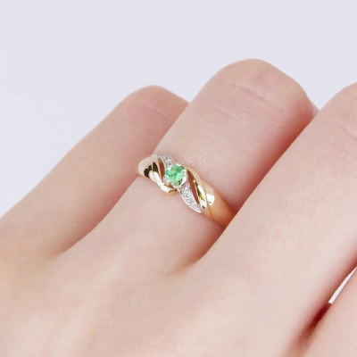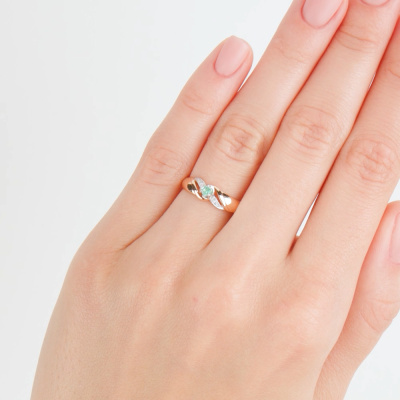 Кольцо с 4 бриллиантами природными, 0.009 карат, огранка круг 17 граней, цвет 2, чистота 2, тип огранки А; 2 бриллиантами природными, 0.004 карат, огранка круг 17 граней, цвет 2, чистота 2, тип огранки А; 1 изумрудом природным, 0.05 карат, цвет 3, чистота 3, тип огранки В; Розовое и белое золото 585 пробы.