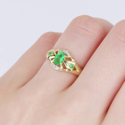 Кольцо с 8 бриллиантами природными, 0.02 карат, огранка круг 17 граней, цвет 2, чистота 2, тип огранки А; 1 изумрудом природным, 0.38 карат, цвет 3, чистота 3, тип огранки Б; 2 изумрудами природными, 0.06 карат, цвет 3, чистота 3, тип огранки В; Желтое золото 585 пробы.