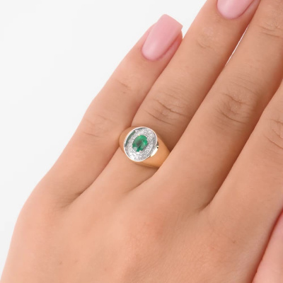 Кольцо с 20 бриллиантами природными, 0.07 карат, огранка круг 17 граней, цвет 2, чистота 2, тип огранки А; 6 бриллиантами природными, 0.01 карат, огранка круг 17 граней, цвет 2, чистота 2, тип огранки А; 1 изумрудом природным, 0.27 карат, цвет 3, чистота 3, тип огранки Б; Желтое золото 585 пробы.