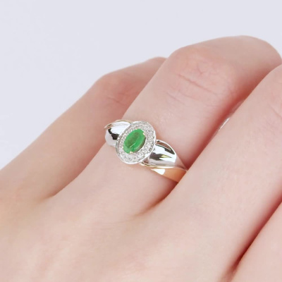 Кольцо с 20 бриллиантами природными, 0.04 карат, огранка круг 17 граней, цвет 2, чистота 2, тип огранки А; 1 изумрудом природным, 0.19 карат, цвет 3, чистота 3, тип огранки Б; Розовое золото 585 пробы.