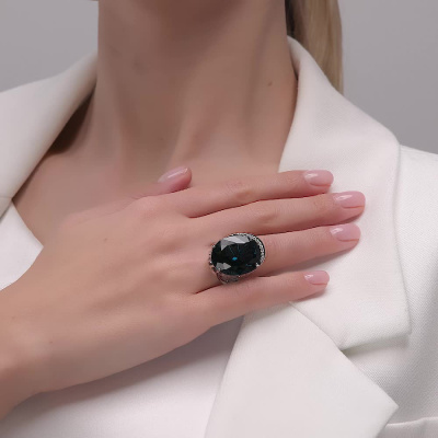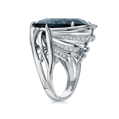 Кольцо с 23 бриллиантами природными, 0.34 карат, огранка круг 57 граней, цвет 3, чистота 5, тип огранки А; 15 бриллиантами природными, 0.12 карат, огранка круг 57 граней, цвет 3, чистота 5, тип огранки А; 16 бриллиантами природными, 0.07 карат, огранка круг 57 граней, цвет 3, чистота 5, тип огранки А; 1 топазом лондон природным, 30.99 карат, тип огранки А; Белое золото 585 пробы.