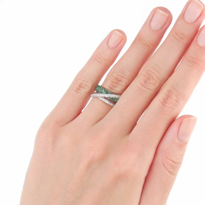 Кольцо с 123 бриллиантами природными, 0.37 карат, огранка круг 17 граней, цвет 2, чистота 2, тип огранки А; 18 изумрудами природными, 0.22 карат, цвет 3, чистота 3, тип огранки В; 34 изумрудами природными, 0.23 карат, цвет 3, чистота 3, тип огранки В; Желтое золото 585 пробы.
