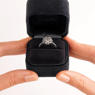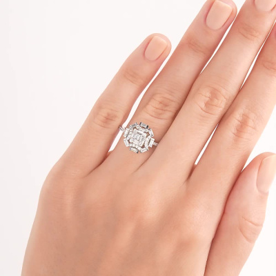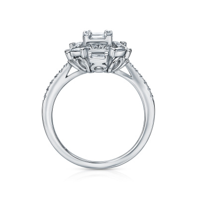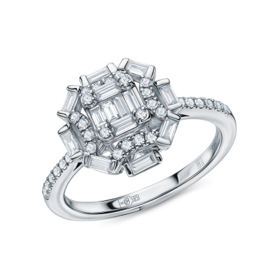 Кольцо с 14 бриллиантами природными, 0.38 карат, огранка багет 33 грани, цвет 3, чистота 3, тип огранки А; 32 бриллиантами природными, 0.2 карат, огранка круг 57 граней, цвет 3, чистота 4, тип огранки А; Белое золото 585 пробы.