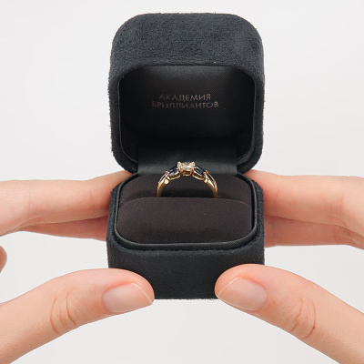 Кольцо с 1 бриллиантом природным, 0.35 карат, огранка овал 57 граней, цвет 8-3, чистота 7, тип огранки А; 6 сапфирами природными, 0.75 карат, цвет 2, чистота 2, тип огранки Б; Желтое золото 750 пробы.