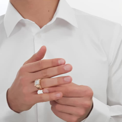 Кольцо с 20 бриллиантами природными, 0.17 карат, огранка круг 57 граней, цвет 3, чистота 6; 16 бриллиантами природными, 0.07 карат, огранка круг 17 граней, цвет 2, чистота 2; Розовое золото 585 пробы.