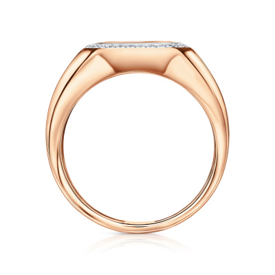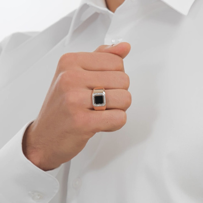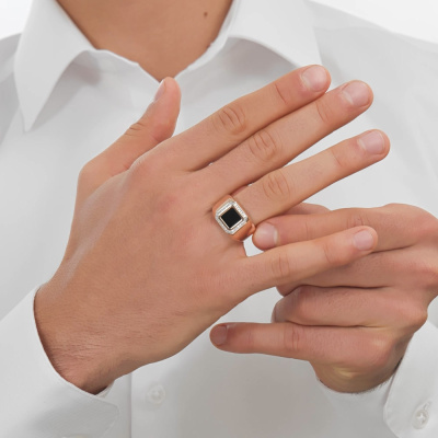 Кольцо с 32 бриллиантами природными, 0.15 карат, огранка круг 17 граней, цвет 2, чистота 2; 1 агатом черным природным, 1.4 карат; Розовое золото 585 пробы.