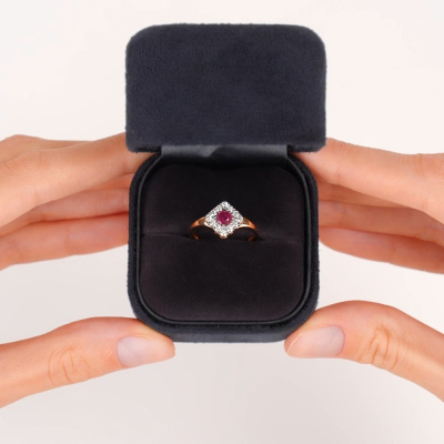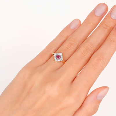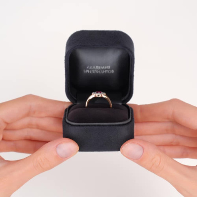 Кольцо с 12 бриллиантами природными, 0.27 карат, огранка круг 57 граней, цвет 3, чистота 6, тип огранки А; 1 рубином природным, 0.3 карат, цвет 2, чистота 2, тип огранки В; Розовое золото 585 пробы.