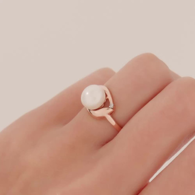 Кольцо с 2 бриллиантами природными, 0.01 карат, огранка круг 17 граней, цвет 2, чистота 2, тип огранки А; 1 жемчугом пресноводным культивированным белым; Розовое золото 585 пробы.