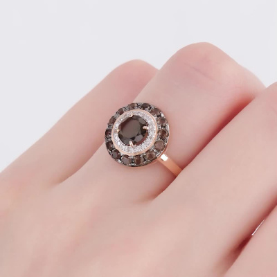 Кольцо с 18 бриллиантами природными, 0.07 карат, огранка круг 17 граней, цвет 2, чистота 2, тип огранки А; 1 кварцем дымчатым природным, 0.72 карат; 14 кварцами дымчатыми природными, 0.44 карат; Розовое золото 585 пробы.