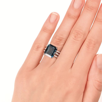 Кольцо с 62 бриллиантами природными, 0.29 карат, огранка круг 17 граней, цвет 2, чистота 2, тип огранки А; 1 топазом лондон природным, 6.95 карат; Белое золото 585 пробы.