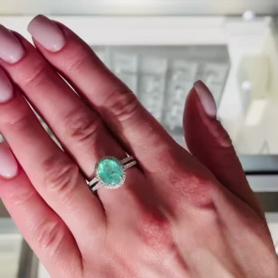 Кольцо с 36 бриллиантами природными, 0.31 карат, огранка круг 57 граней, цвет 3, чистота 6, тип огранки А; 60 бриллиантами природными, 0.26 карат, огранка круг 17 граней, цвет 2, чистота 2, тип огранки Б; 1 турмалином параиба природным, 2.2 карат; Белое золото 750 пробы.