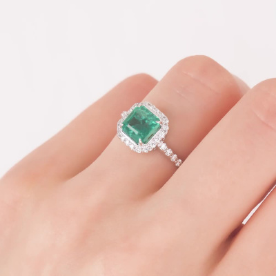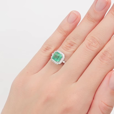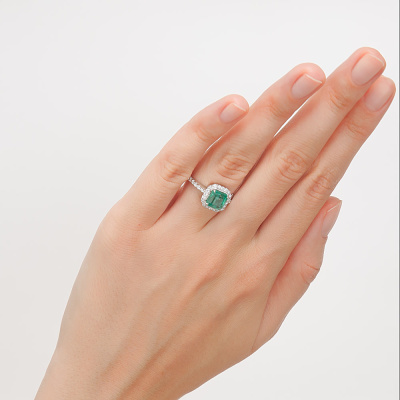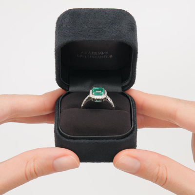 Кольцо с 30 бриллиантами природными, 0.26 карат, огранка круг 57 граней, цвет 3, чистота 6, тип огранки А; 1 изумрудом природным, 1.81 карат, цвет 3, чистота 3, тип огранки Б; Белое золото 750 пробы.