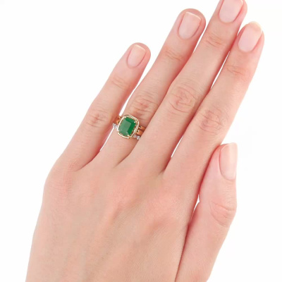 Кольцо с 10 бриллиантами природными, 0.07 карат, огранка круг 57 граней, цвет 3, чистота 6, тип огранки А; 1 изумрудом природным, 1.58 карат, цвет 3, чистота 3, тип огранки Б; Желтое золото 750 пробы.