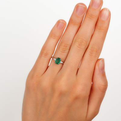 Кольцо с 2 бриллиантами природными, 0.086 карат, огранка багет 25 граней, цвет 3, чистота 6, тип огранки А; 1 изумрудом природным, 0.87 карат, цвет 3, чистота 3, тип огранки Б; Белое золото 585 пробы.