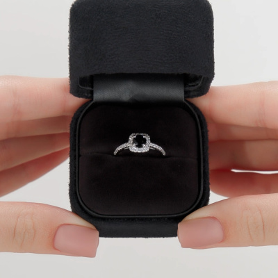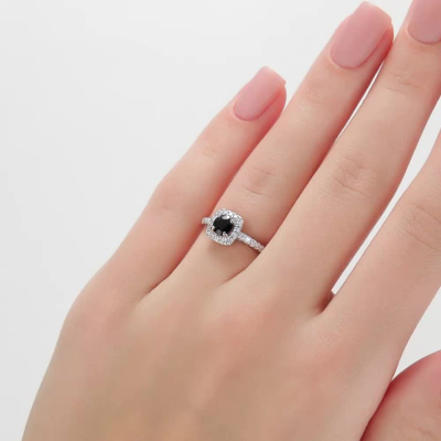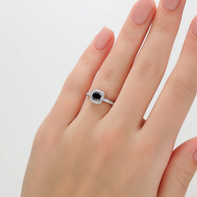 Кольцо с 30 бриллиантами природными, 0.23 карат, огранка круг 57 граней, цвет 3, чистота 6, тип огранки А; 1 сапфиром природным, 0.64 карат, цвет 2, чистота 2, тип огранки В; Белое золото 585 пробы.