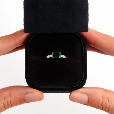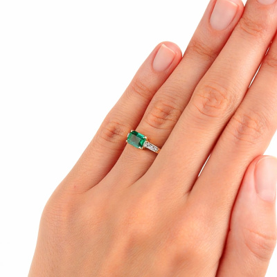 Кольцо с 2 бриллиантами природными, 0.02 карат, огранка круг 57 граней, цвет 3, чистота 6, тип огранки А; 2 бриллиантами природными, 0.01 карат, огранка круг 57 граней, цвет 3, чистота 6, тип огранки А; 2 бриллиантами природными, 0.01 карат, огранка круг 57 граней, цвет 3, чистота 6, тип огранки А; 1 изумрудом природным, 0.92 карат, цвет 3, чистота 3, тип огранки Б; Желтое золото 585 пробы.