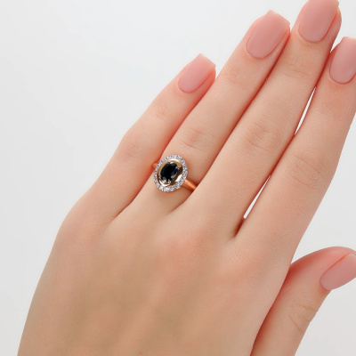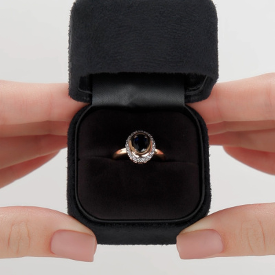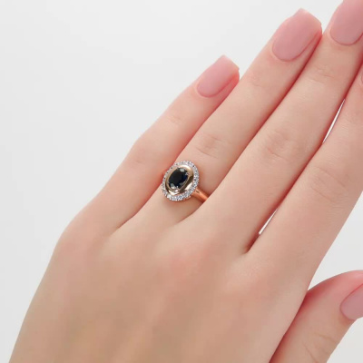 Кольцо с 18 бриллиантами природными, 0.31 карат, огранка круг 57 граней, цвет 3, чистота 6, тип огранки А; 1 сапфиром природным, 1.04 карат, цвет 2, чистота 2, тип огранки Б; Розовое золото 585 пробы.