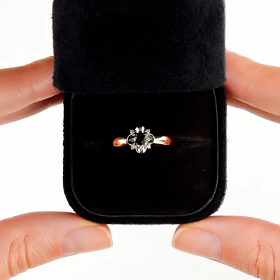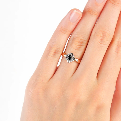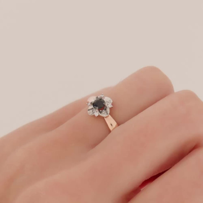 Кольцо с 4 бриллиантами природными, 0.02 карат, огранка круг 57 граней, цвет 3, чистота 6, тип огранки А; 4 бриллиантами природными, 0.02 карат, огранка круг 17 граней, цвет 2, чистота 2, тип огранки А; 1 сапфиром природным, 0.27 карат, цвет 2, чистота 2, тип огранки В; Розовое и белое золото 585 пробы.