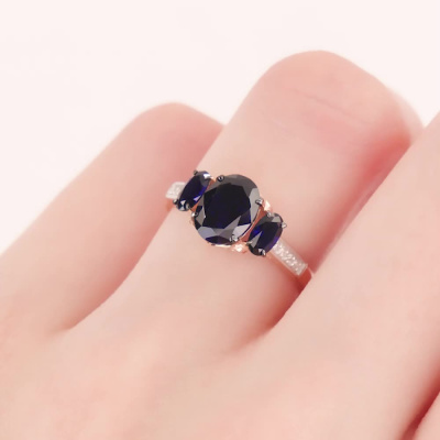 Кольцо с 8 бриллиантами природными, 0.02 карат, огранка круг 17 граней, цвет 2, чистота 2, тип огранки А; 1 сапфиром синтетическим, 1.44 карат; 2 сапфирами синтетическими, 0.49 карат; Розовое золото 585 пробы.