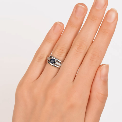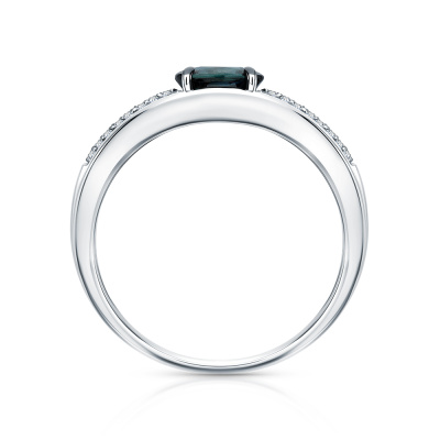 Кольцо с 48 бриллиантами природными, 0.12 карат, огранка круг 17 граней, цвет 2, чистота 2, тип огранки А; 1 сапфиром природным, 0.58 карат, цвет 2, чистота 2, тип огранки Б; Белое золото 585 пробы.