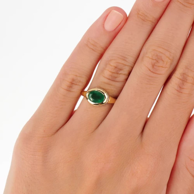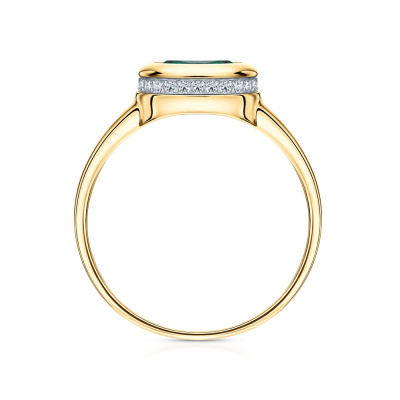Кольцо с 23 бриллиантами природными, 0.11 карат, огранка круг 17 граней, цвет 2, чистота 2, тип огранки А; 1 изумрудом природным, 0.91 карат, цвет 4, чистота 3, тип огранки Б; Желтое золото 585 пробы.