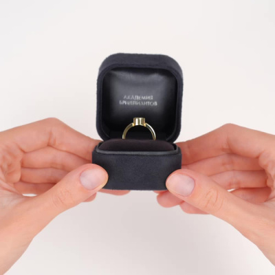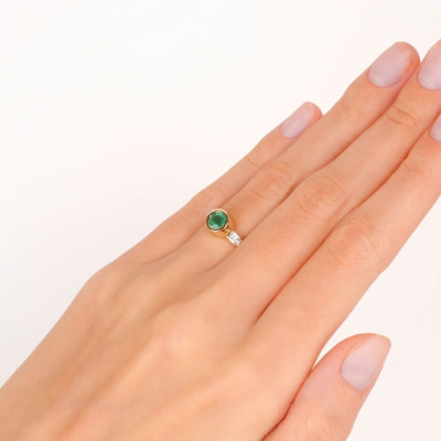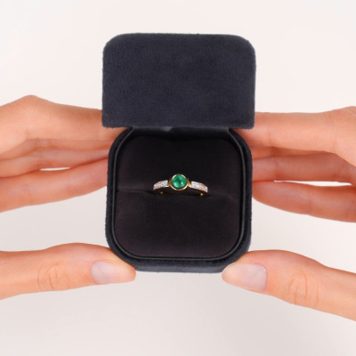 Кольцо с 10 бриллиантами природными, 0.07 карат, огранка круг 57 граней, цвет 3, чистота 6, тип огранки А; 1 изумрудом природным, 0.47 карат, цвет 3, чистота 3, тип огранки В; Желтое золото 585 пробы.