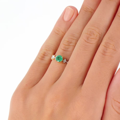 Кольцо с 8 бриллиантами природными, 0.03 карат, огранка круг 17 граней, цвет 2, чистота 2, тип огранки А; 1 изумрудом природным, 0.44 карат, цвет 3, чистота 3, тип огранки В; Желтое золото 585 пробы.