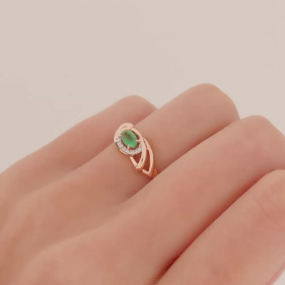 Кольцо с 7 бриллиантами природными, 0.01 карат, огранка круг 17 граней, цвет 2, чистота 2, тип огранки А; 1 изумрудом природным, 0.19 карат, цвет 3, чистота 3, тип огранки Б; Розовое золото 585 пробы.