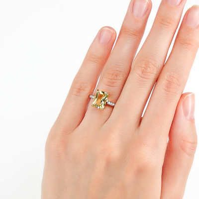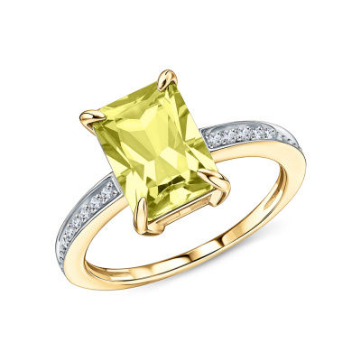 Кольцо с 6 бриллиантами природными, 0.04 карат, огранка круг 57 граней, цвет 3, чистота 6, тип огранки А; 6 бриллиантами природными, 0.02 карат, огранка круг 17 граней, цвет 2, чистота 2, тип огранки А; 1 кварцем лимонным природным, 2.26 карат; Желтое золото 585 пробы.