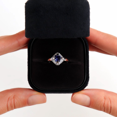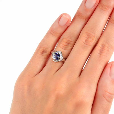 Кольцо с 16 бриллиантами природными, 0.05 карат, огранка круг 17 граней, цвет 2, чистота 2, тип огранки А; 8 бриллиантами природными, 0.01 карат, огранка круг 17 граней, цвет 2, чистота 2, тип огранки А; 1 танзанитом природным, 0.85 карат; Белое золото 585 пробы.