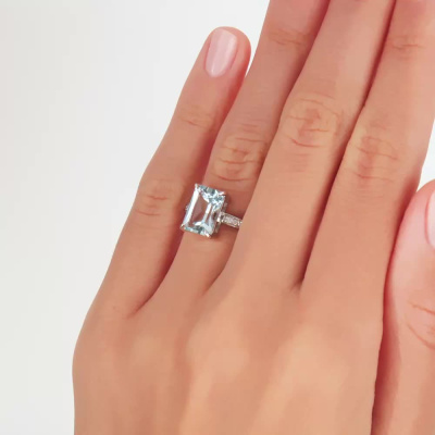 Кольцо с 6 бриллиантами природными, 0.04 карат, огранка круг 57 граней, цвет 3, чистота 6, тип огранки А; 6 бриллиантами природными, 0.02 карат, огранка круг 17 граней, цвет 2, чистота 2, тип огранки А; 1 топазом скай природным, 3.26 карат; Белое золото 585 пробы.