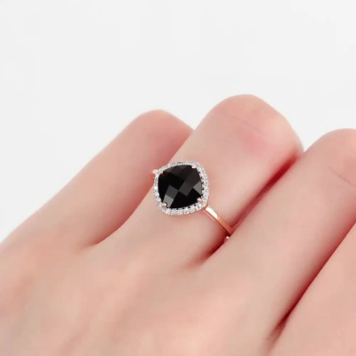 Кольцо с 24 бриллиантами природными, 0.11 карат, огранка круг 17 граней, цвет 2, чистота 2, тип огранки А; 1 агатом черным природным, 1.68 карат, тип огранки Б; Розовое золото 585 пробы.
