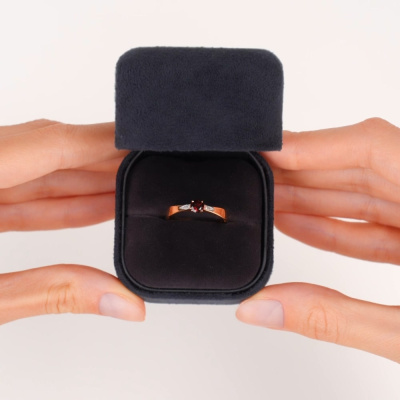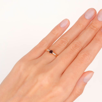 Кольцо с 2 бриллиантами природными, 0.01 карат, огранка круг 17 граней, цвет 2, чистота 2, тип огранки А; 1 гранатом природным, 0.32 карат, тип огранки Б; Розовое золото 585 пробы.