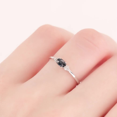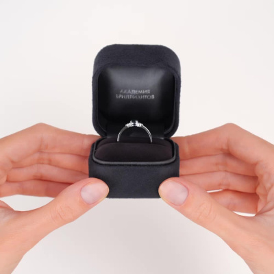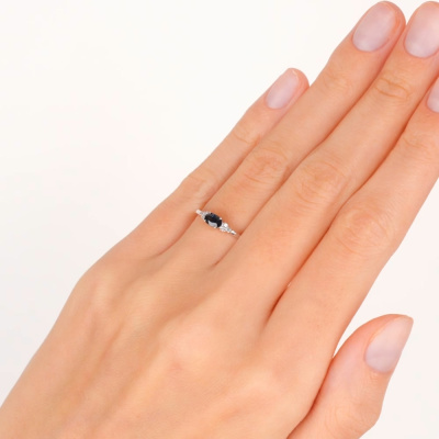 Кольцо с 6 бриллиантами природными, 0.03 карат, огранка круг 17 граней, цвет 2, чистота 2, тип огранки А; 1 сапфиром природным, 0.3 карат, цвет 2, чистота 2, тип огранки Б; Белое золото 585 пробы.