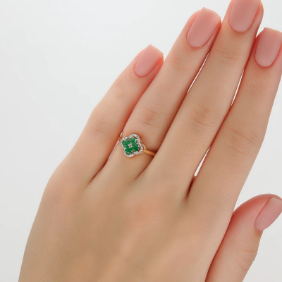 Кольцо с 24 бриллиантами природными, 0.07 карат, огранка круг 17 граней, цвет 2, чистота 2, тип огранки А; 4 изумрудами природными, 0.31 карат, цвет 3, чистота 3, тип огранки В; Желтое золото 585 пробы.